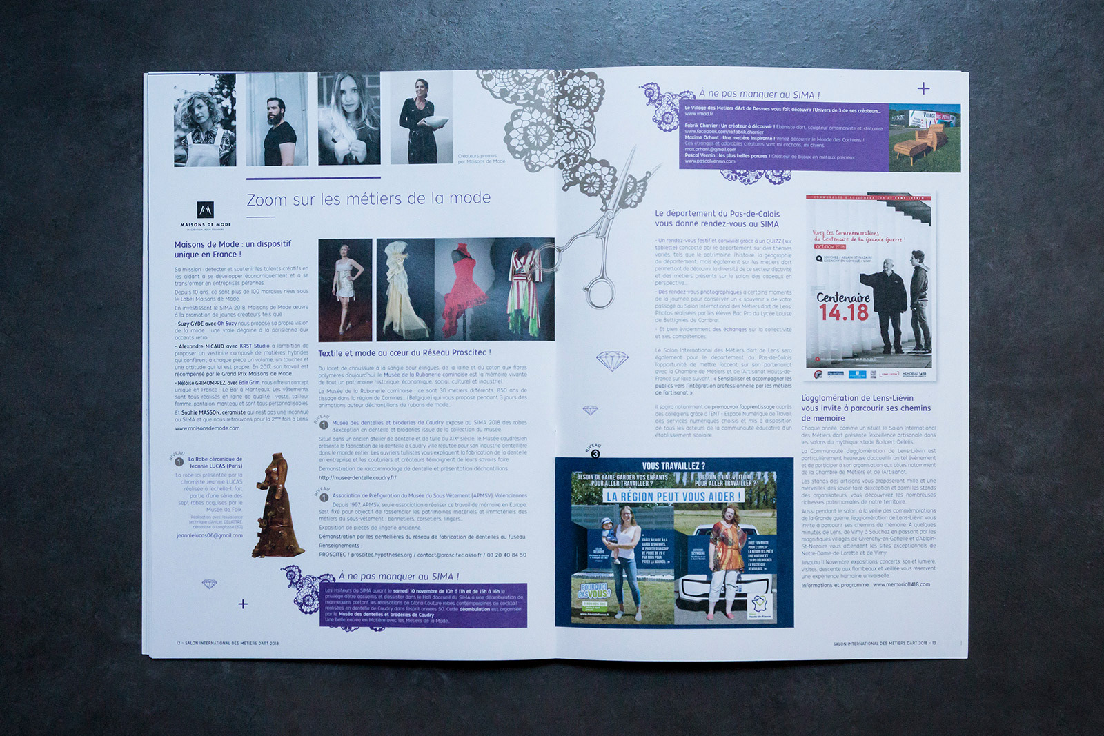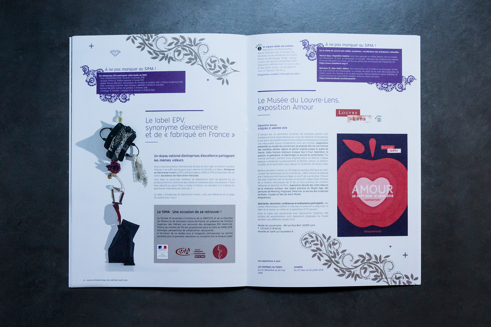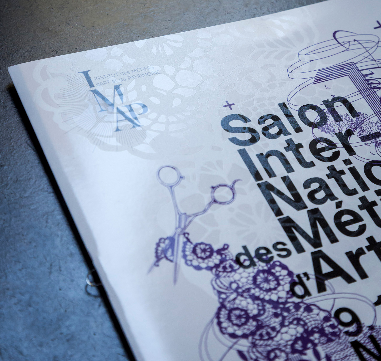 Brochure A4 de 20 pages présentant la mission de l'IMAP, le programme du Salon International des Métiers d'Art ainsi que les exposants et leurs travaux. Vernis dripp off sur la couverture.