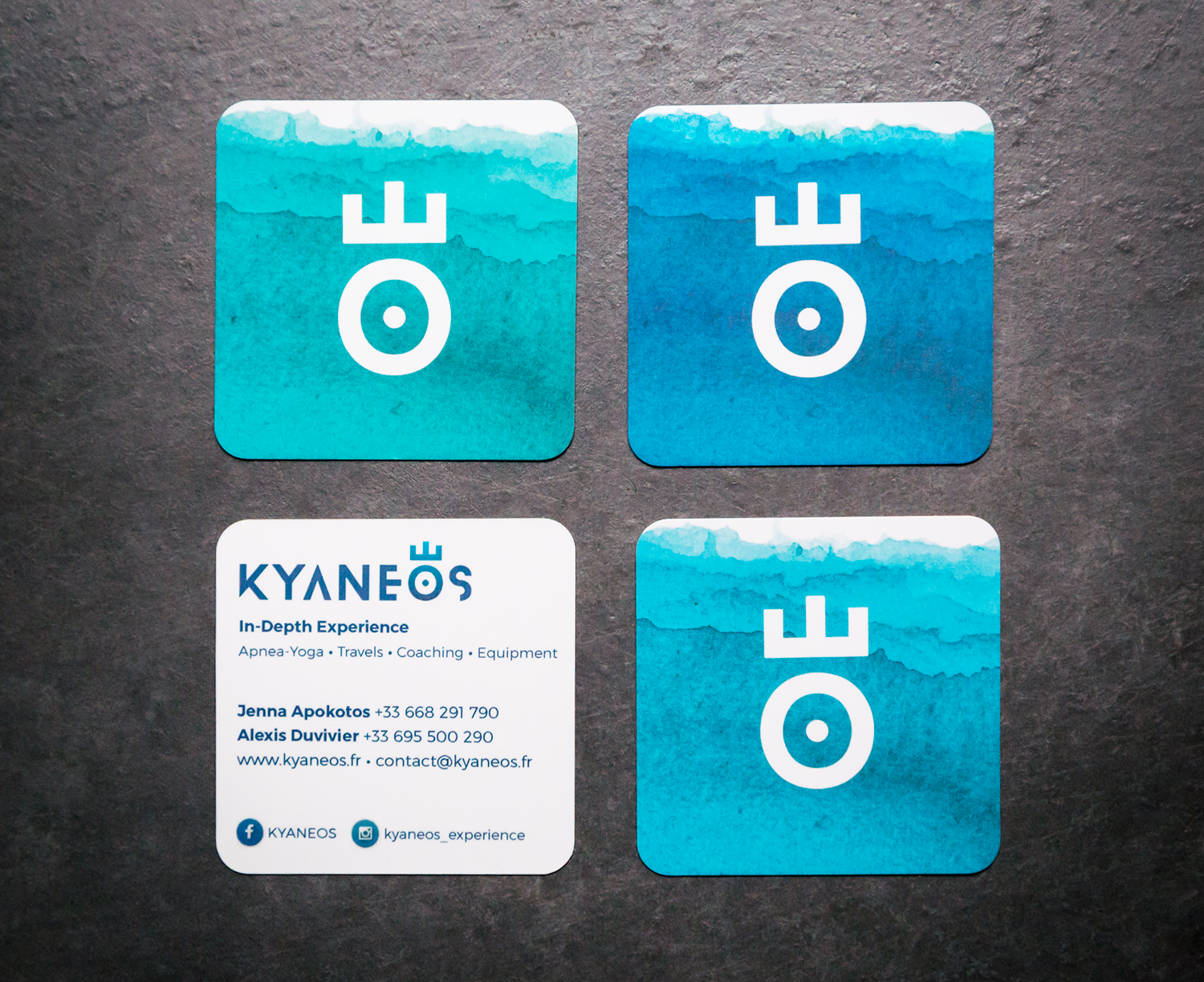 Jenna Apokotos and Alexis Duvivier are two great apnea champions (world records 2015). They launch their activity around the apnea + well-being (yoga, nutrition, coaching). Originally named JADE, the name had to evolve to follow their new concept. I created their logo, diving suit design and business cards.